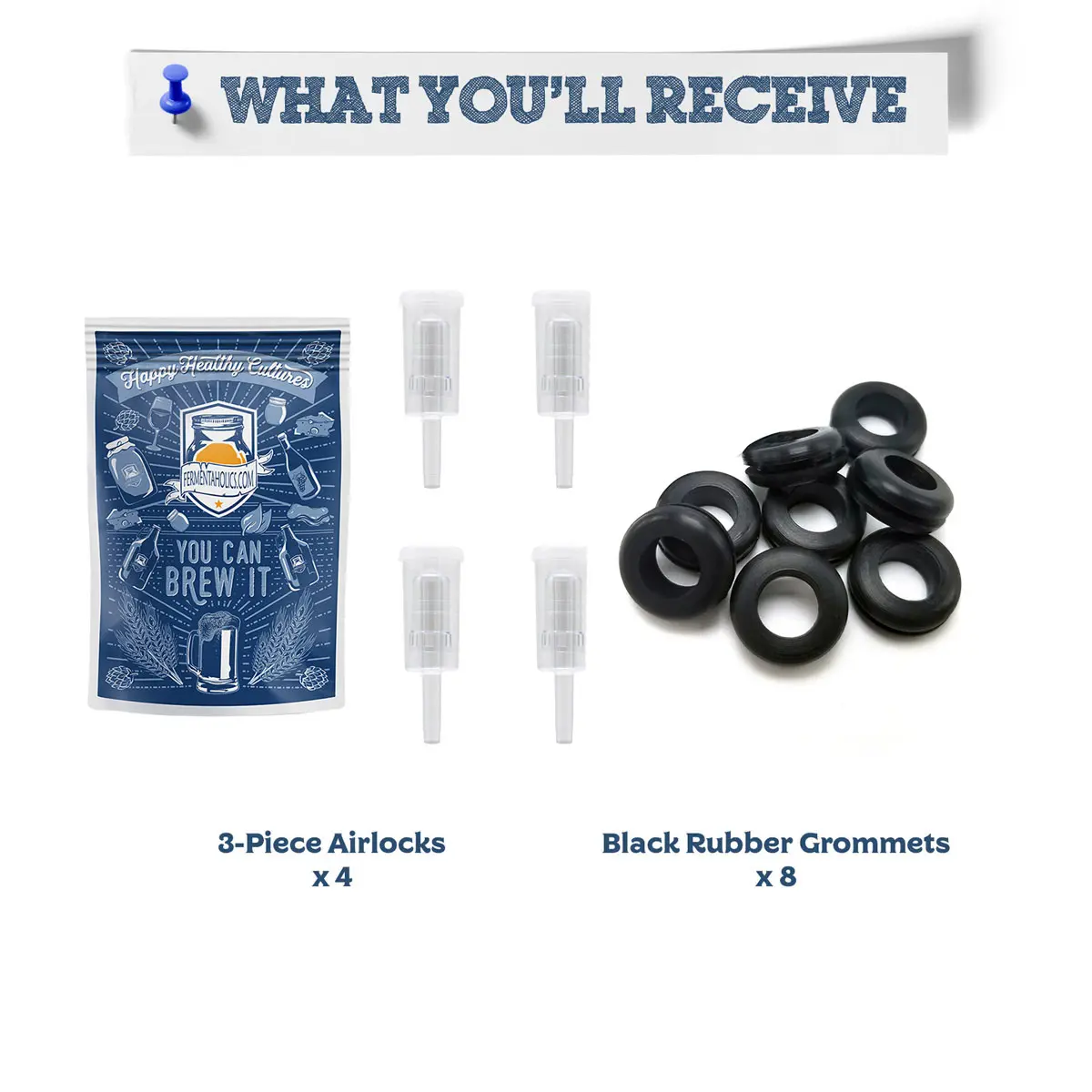 This pack of 4 airlocks with 8 grommets will allow you to turn your containers, buckets, jars, and more into a fermentation vessel. Whatever size batch you are looking to brew or ferment, simply drill a hole in the lid and easily insert the rubber grommet and 3-piece airlock: time to ferment!