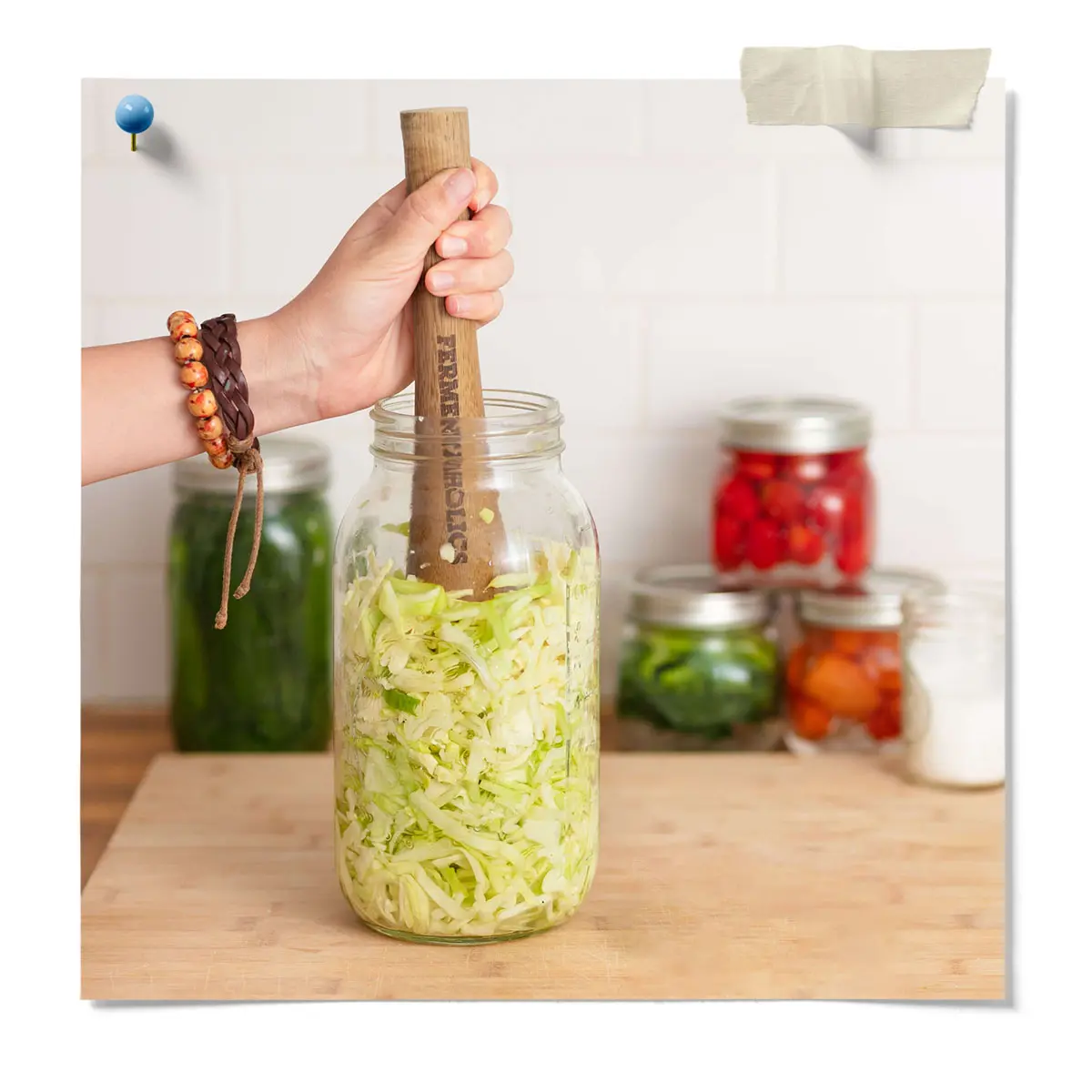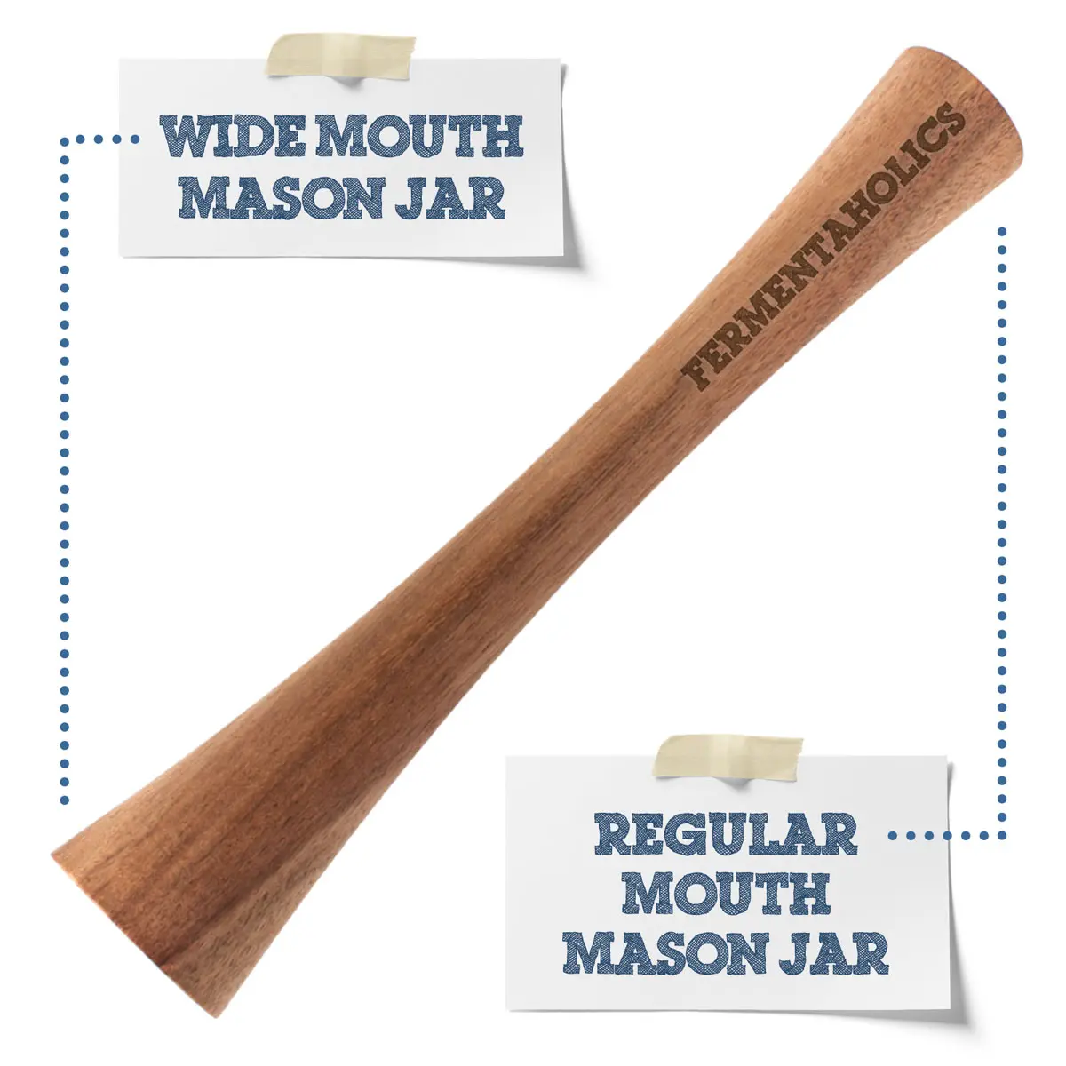 By packing down your cabbage, the Acacia Wood Tamper Tool aids in compressing and getting rid of the air in the jar before you begin the fermentation process. Each end is designed to fit in a wide mouth or regular mouth mason jar! Perfect for half-gallon, quart, or pint jars.