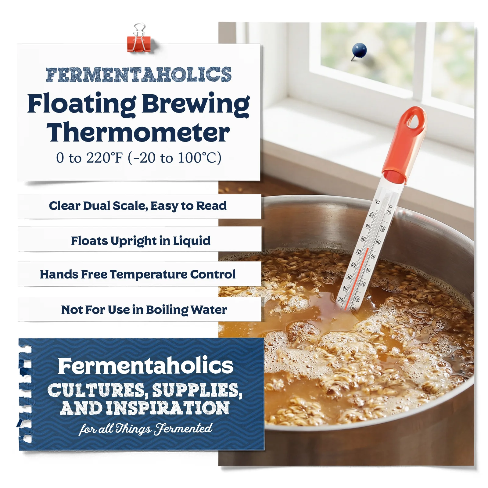 This 9-inch floating glass thermometer is convenient for taking temperatures in a wide range of kitchen and fermentation tasks. It reads from 0–220°F (–20 to 100°C) and displays in both Fahrenheit and Celsius.