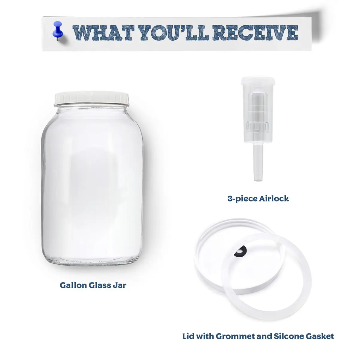 With this Fermentaholics Jar, Lid, and 3 Piece Airlock, you can start brewing immediately! This pack has the equipment to start brewing beer, cider, hard kombucha, sauerkraut, wine, kimchi, or any other small batch ferment.
