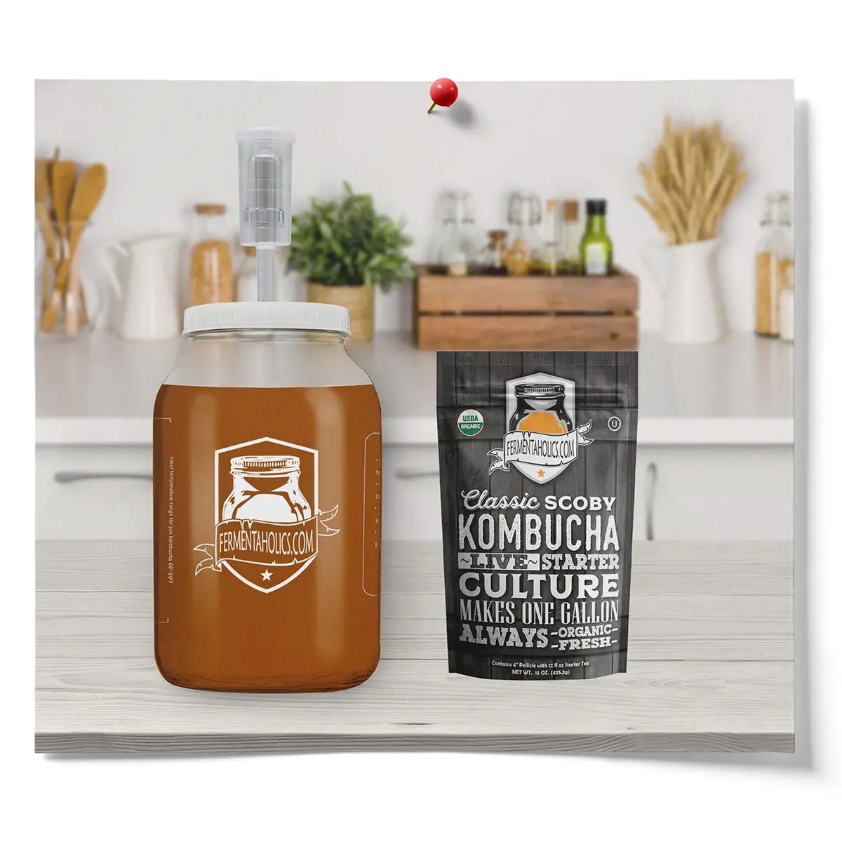Start your fermentation with the Fermentaholics One Gallon Fermentation Pack! This set includes a one-gallon fermentation jar, lid, and airlock – all the essential tools you need to kick-off your fermentation adventures. With this kit, you’ll be ready to ferment a variety of food and drinks, like beer, cider, hard kombucha, sauerkraut, wine, kimchi, pickles, milk kefir, water kefir, and more, all in the comfort of your home.