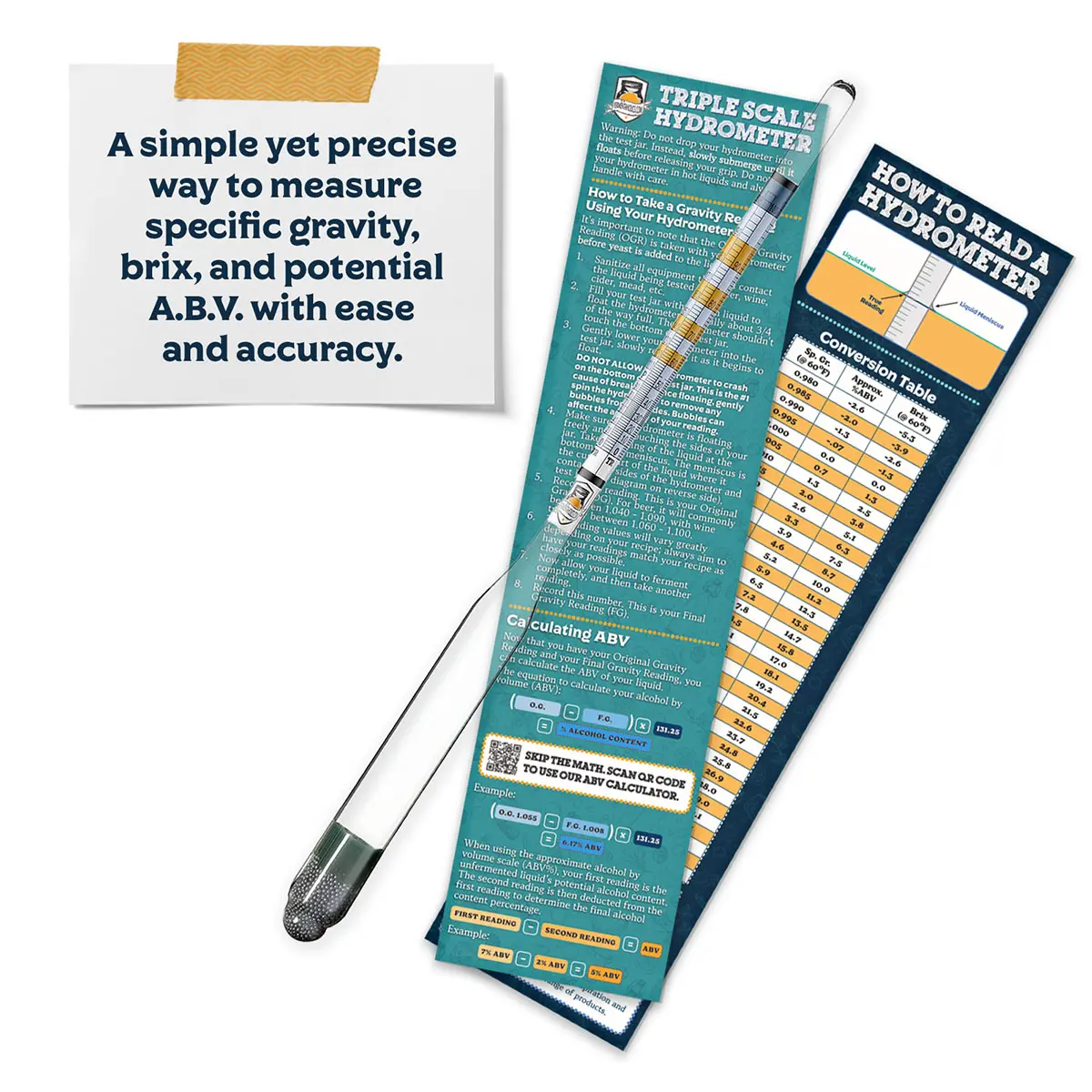 This Triple Scale Hydrometer is the used to measure specific gravity, brix, and potential alcohol percentage in your brew. Hydrometer readings can also be used to determine alcohol content by taking a reading before and after fermentation. In addition, it can be used to monitor the progression of fermentation in your wine, beer, hard kombucha, cider, and more! The package comes with a triple scale hydrometer, a step-by-step direction guide on how to do gravity readings and use your hydrometer, and a conversion table. The conversion table helps you understand all three scales, including specific gravity of liquids, BRIX (sugar content), and potential alcohol.