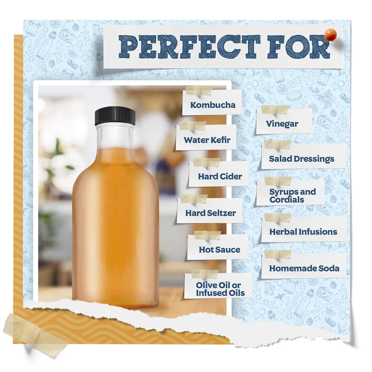 Whether you’re making your own kombucha, kefir, ginger beer, hard seltzer, soda or beer, these bottles will do the job! The wide-mouth design is great if you like to use chopped fresh fruit to flavor your ferments.