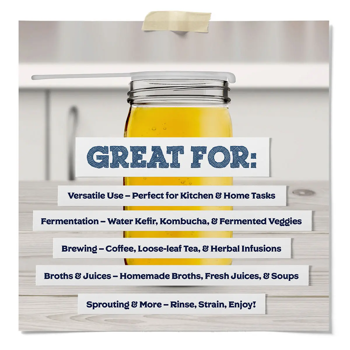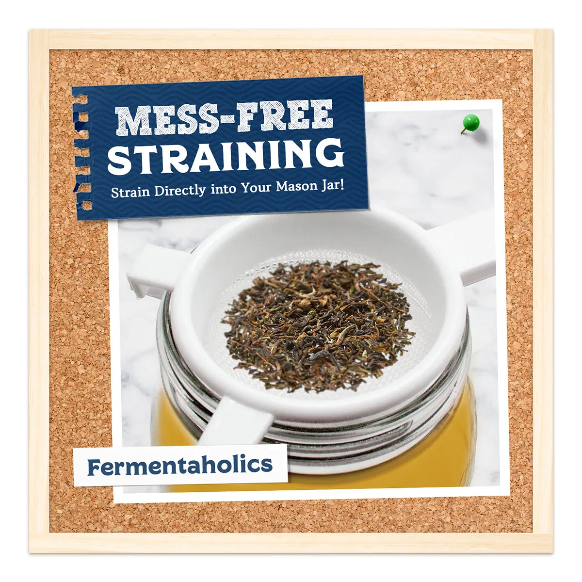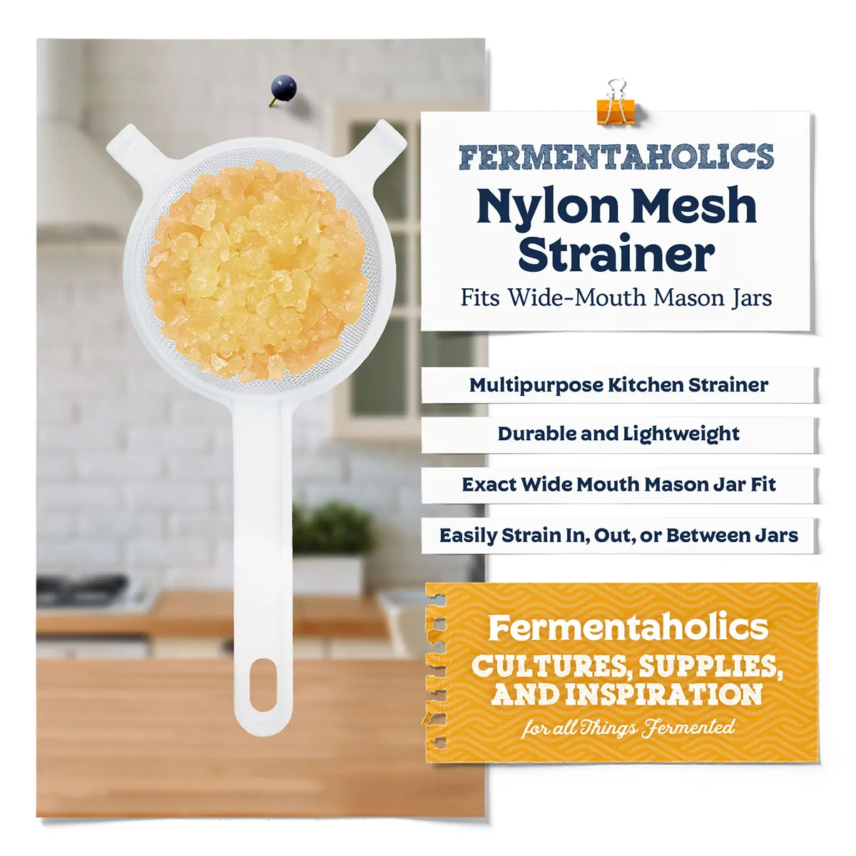 This white mesh strainer is designed to make homebrewing water kefir easier: less mess, less waste, and more delicious water kefir for you to enjoy, all while keeping your water kefir culture safe and ready for more brews.