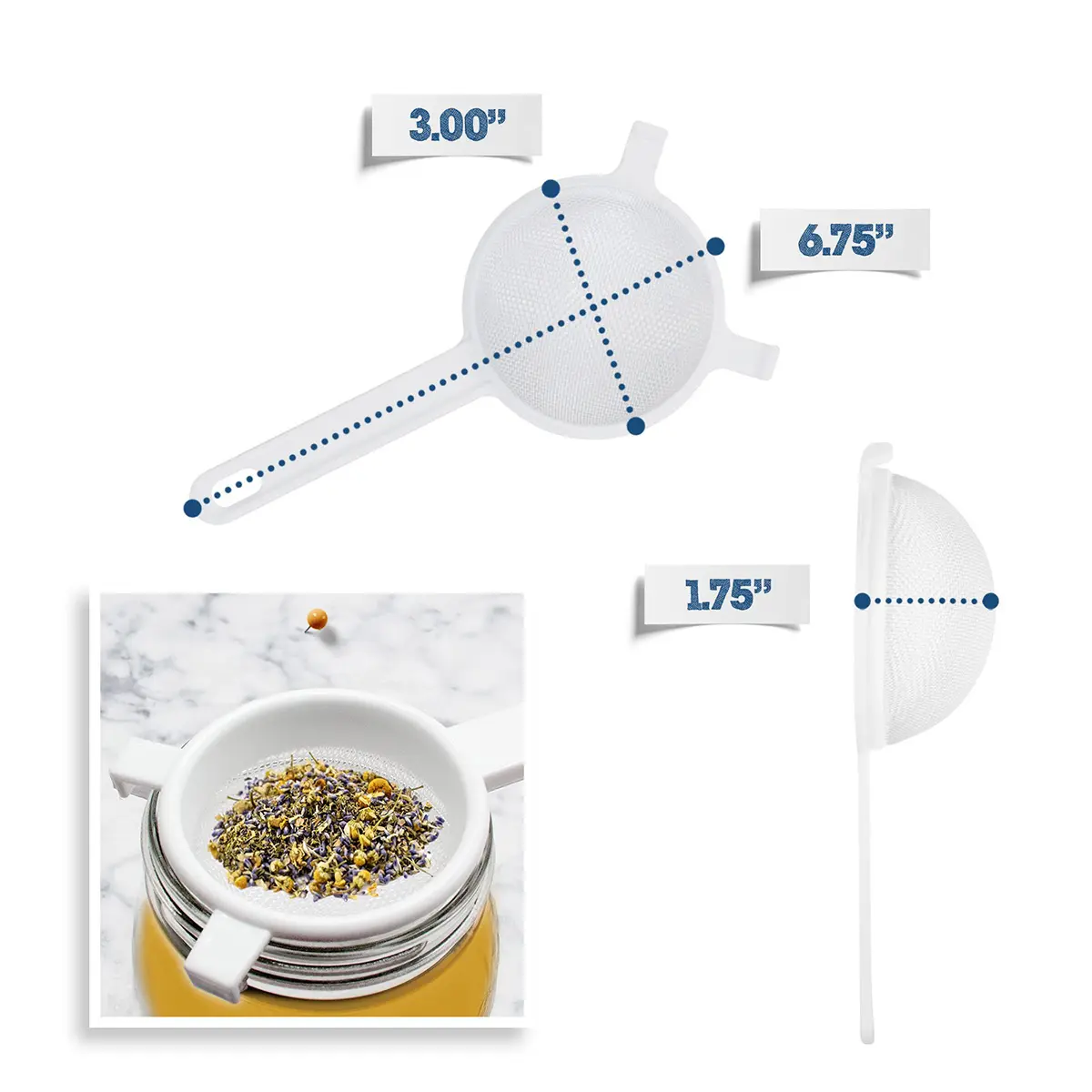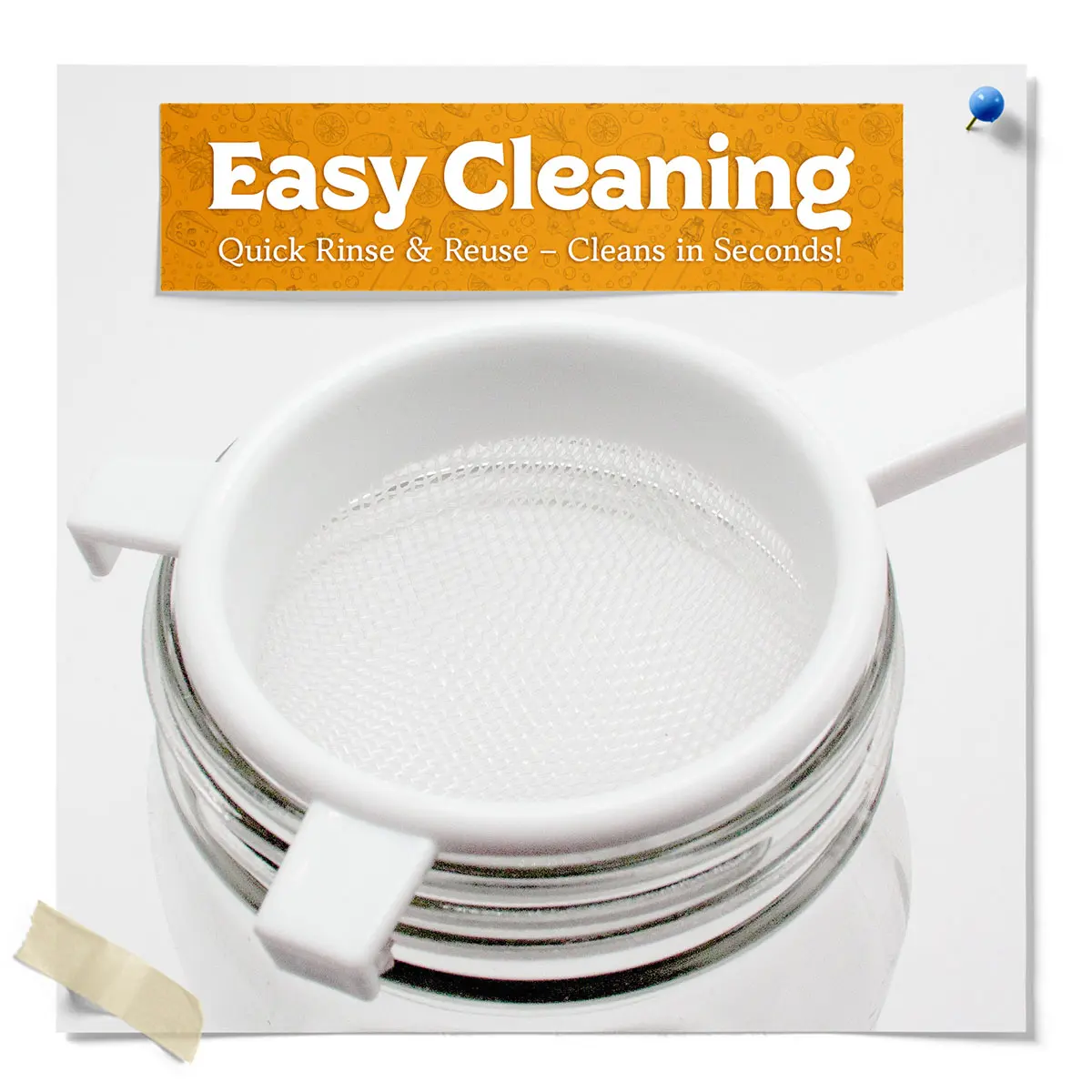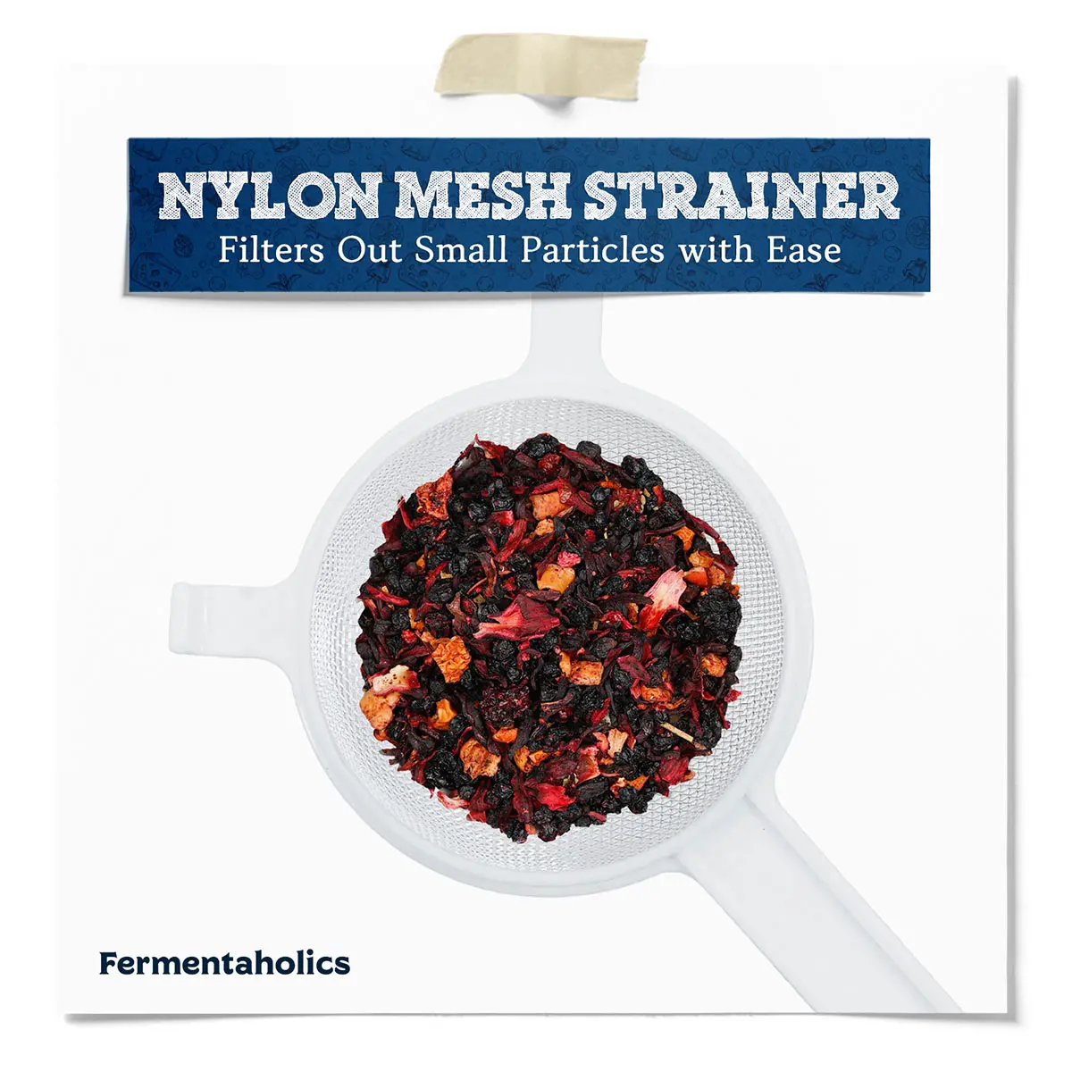 This white mesh strainer is designed to make homebrewing water kefir easier: less mess, less waste, and more delicious water kefir for you to enjoy, all while keeping your water kefir culture safe and ready for more brews.