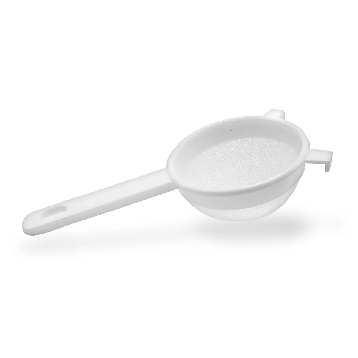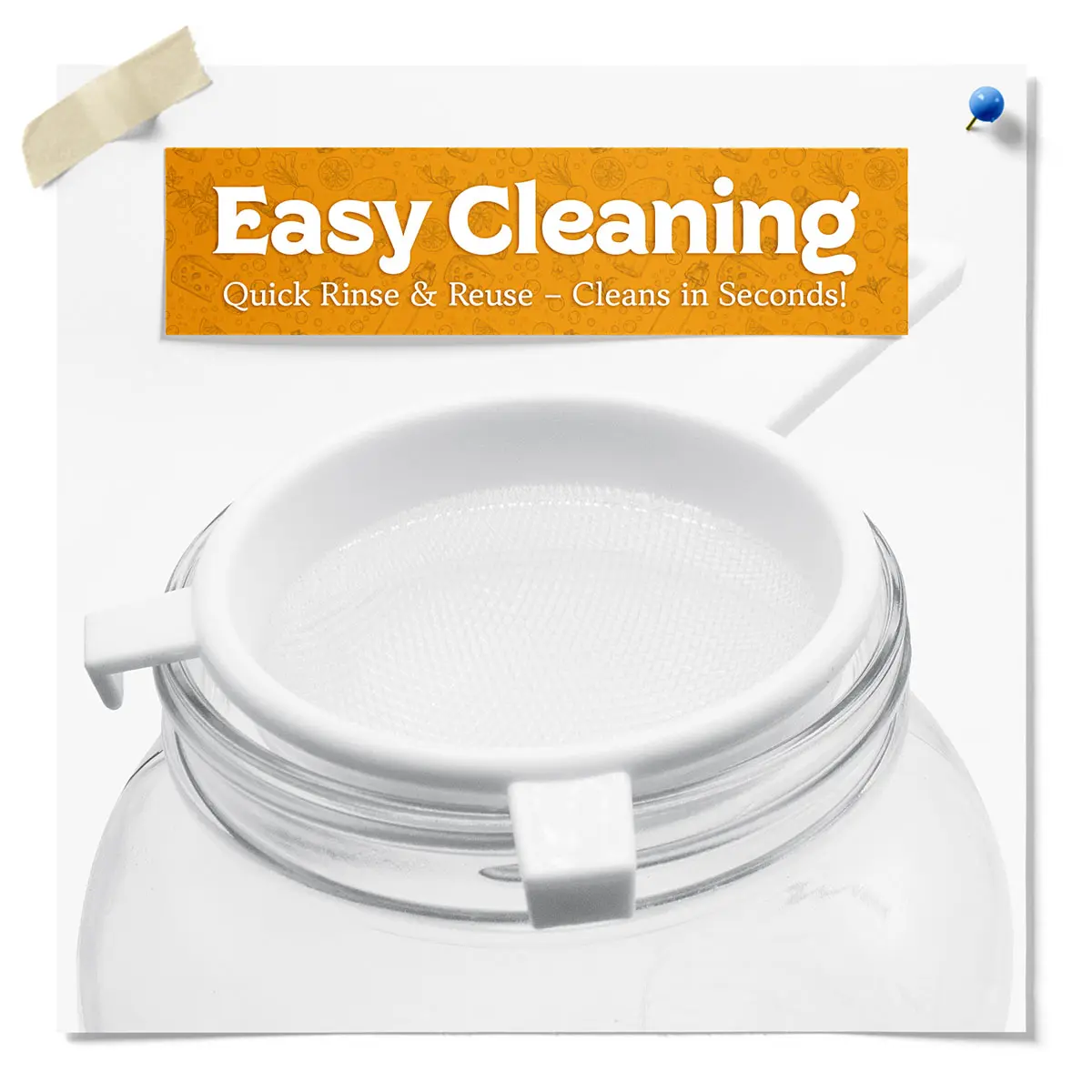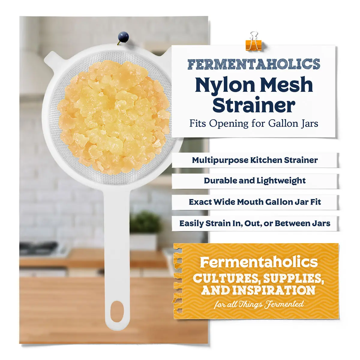 This larger 3.75″nylon mesh strainer is great for gallon jars and is a must-have for use around the kitchen and homebrewers alike. Great fit for gallon jars, it offers a convenient and efficient way to strain liquids from solids, whether you’re making stocks or juices or when straining water kefir grains or solids from secondary fermentation. Made from durable nylon mesh, this food-grade strainer is easy to clean, and gentle on non-stick surfaces, ensuring longevity and around your kitchen for years to come. It has a sturdy handle that rests on the opening of the jar for stability when straining, making straining easy.
