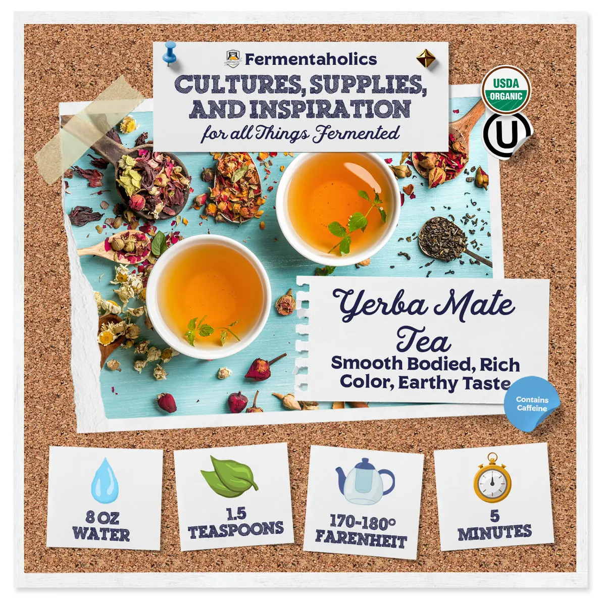 Organic Yerba Mate, USDA Certified Organic and OU Kosher Certified, is a premium loose-leaf tea sourced from pesticide-free farms. Each 4 oz bag brews 12 gallons of kombucha or 72 cups of tea. Enjoy it hot, iced, or as a kombucha base with smooth, long-lasting energy and low acidity.