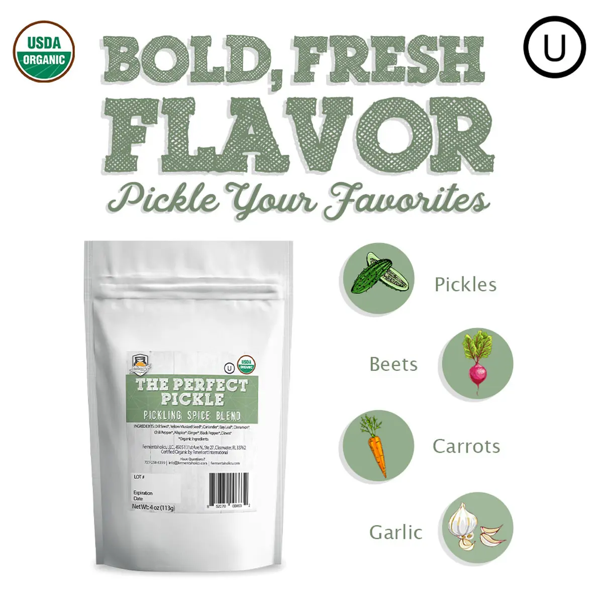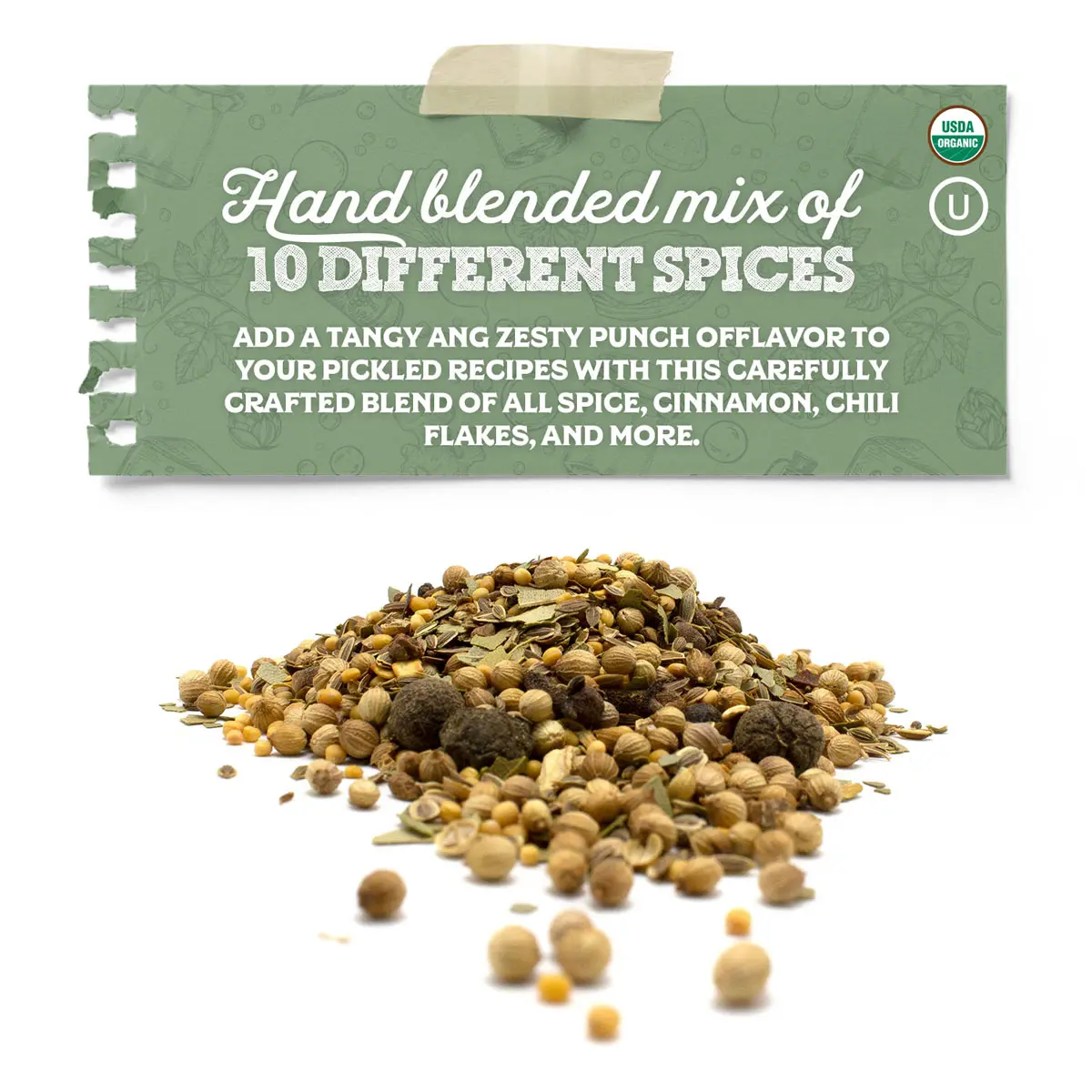 Our pickling spice seasoning is hand blended with a perfectly balanced mix of mustard seed, coriander seeds, allspice, dill seed, bay leaves, red chilies, cinnamon, and black pepper. Fermentaholics Pickling Spices add the right flavor balance to the pickling process providing a sweet, spicy, tangy taste and aroma. This versatile blend goes great with vinegar pickles & Lacto-fermented (sour) pickles. Just the right zesty punch to add flavor and crunch to your homemade pickles. Pickled Seasoning comes in a resealable bag to ensure freshness and quality with every use.