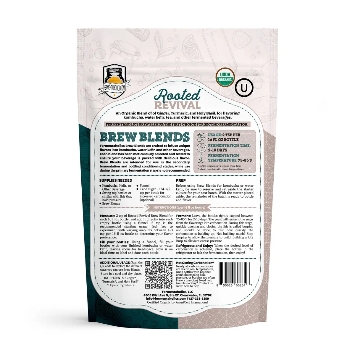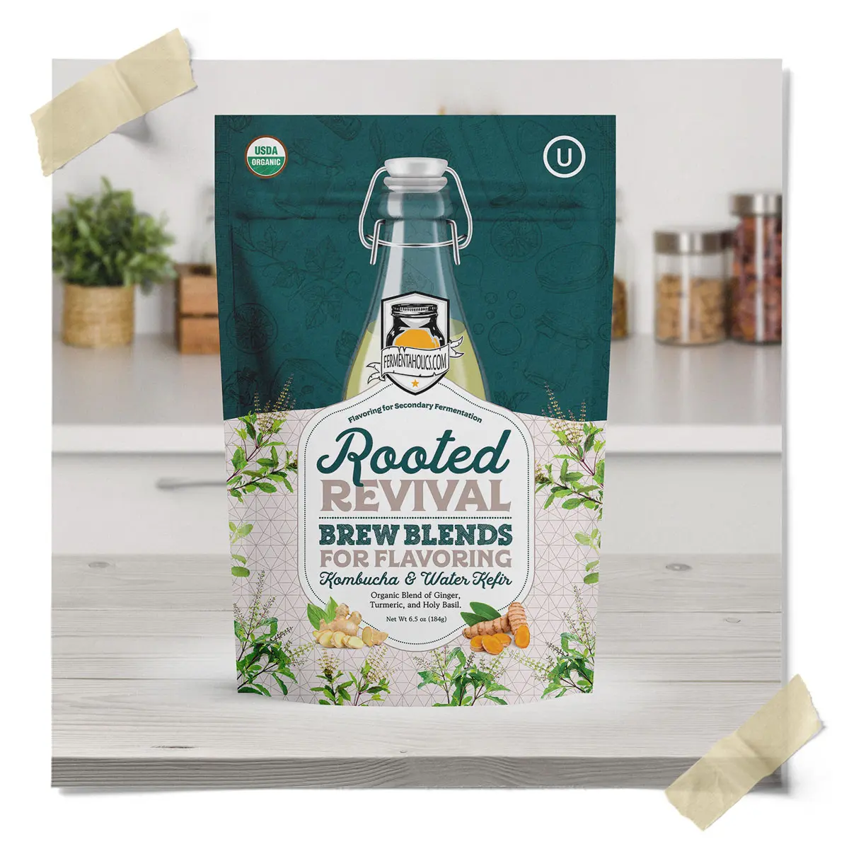 Create captivating and delightful brews with Rooted Revival. A blend of Organic Ginger, Turmeric, and Holy Basil crafted to enhance the flavors of your favorite fermented beverages. Whether you’re a kombucha enthusiast, water kefir connoisseur, or tea aficionado.