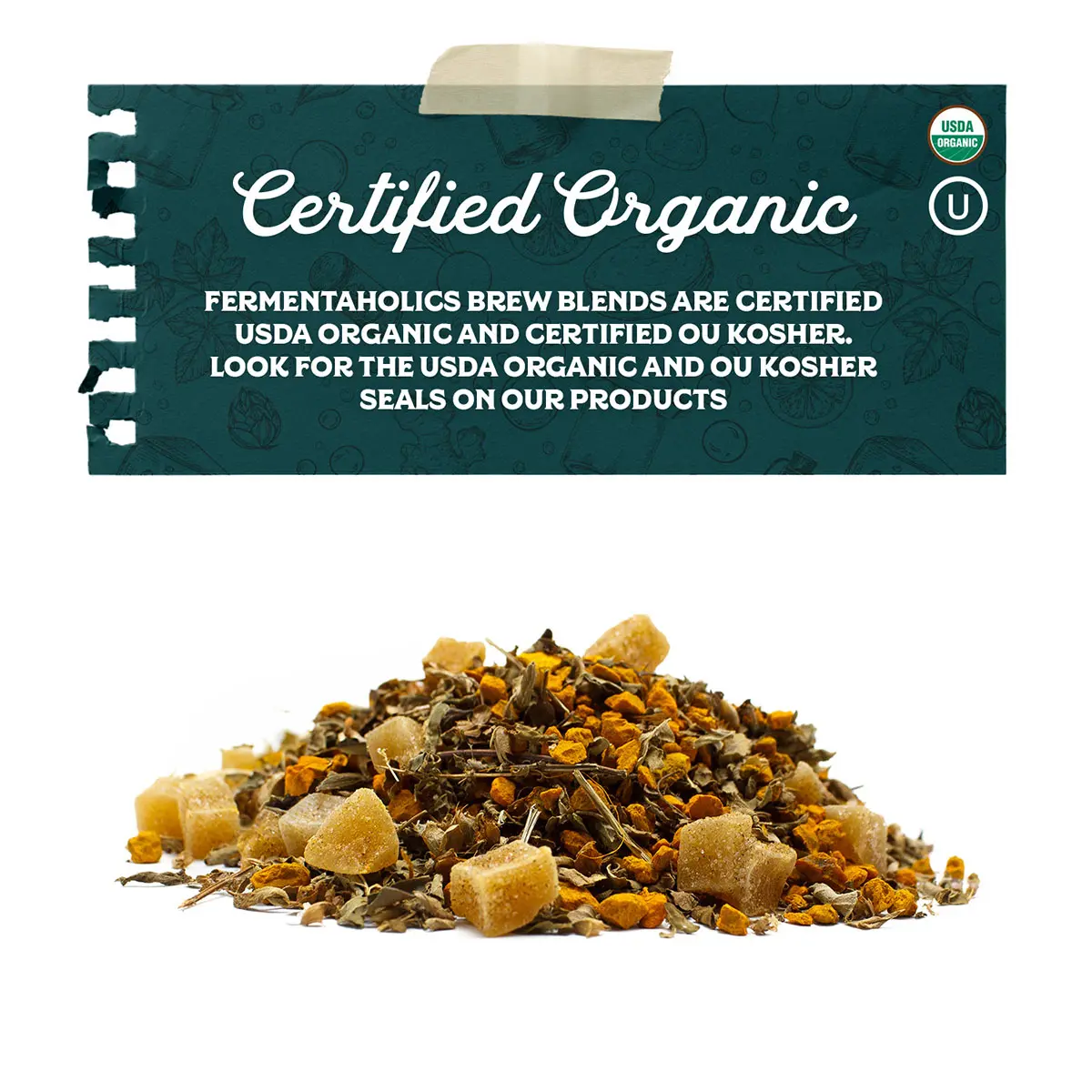 Rooted Revival, Organic – 6.5 oz, your essential companion for enhancing the flavors of your homemade fermented beverages. This blend combines the natural goodness of ginger, turmeric, and holy basil, offering a delightful infusion that elevates your kombucha, water kefir, tea, and other fermented creations. Made with the utmost care and commitment to organic quality, it’s the perfect choice for those seeking a wholesome, natural twist to their favorite drinks.