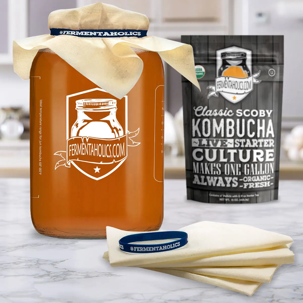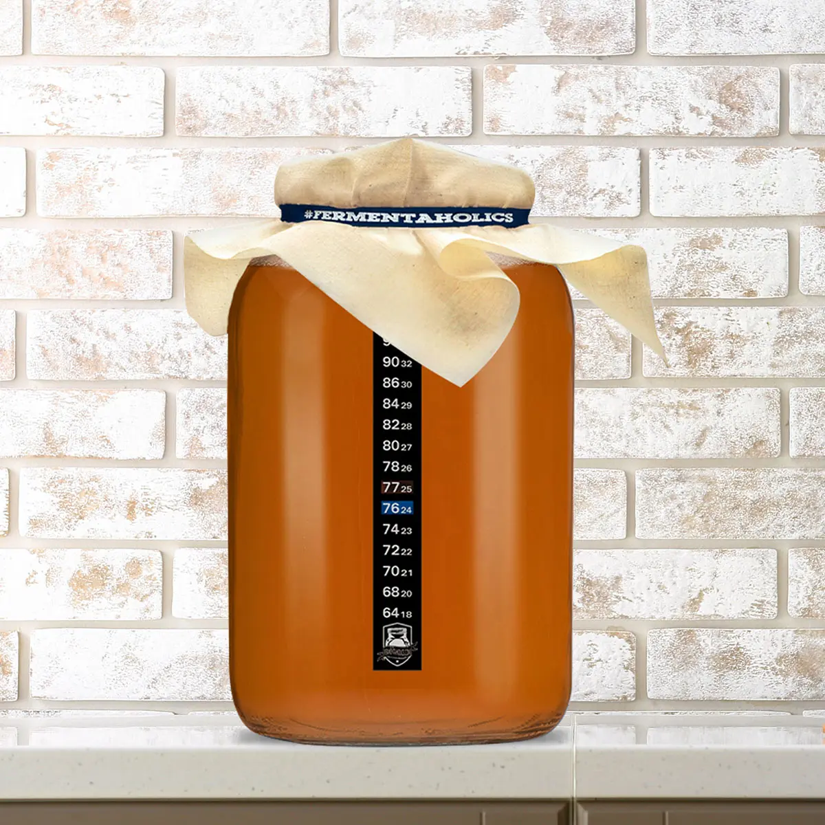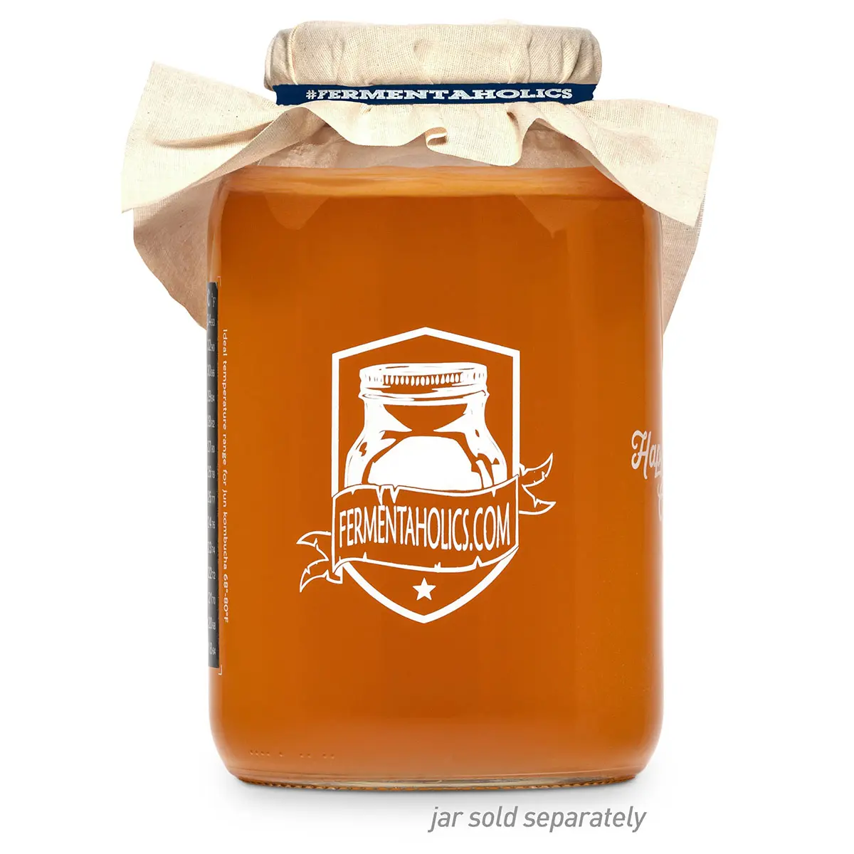 Our 100% unbleached muslin squares with rubber bands are perfect for your kombucha, water kefir, or sourdough starter brewing process! These 10″ squares are designed with a tight weave that keeps fruit flies and other bugs out of your brew, preventing them from infesting and laying eggs on your SCOBY.