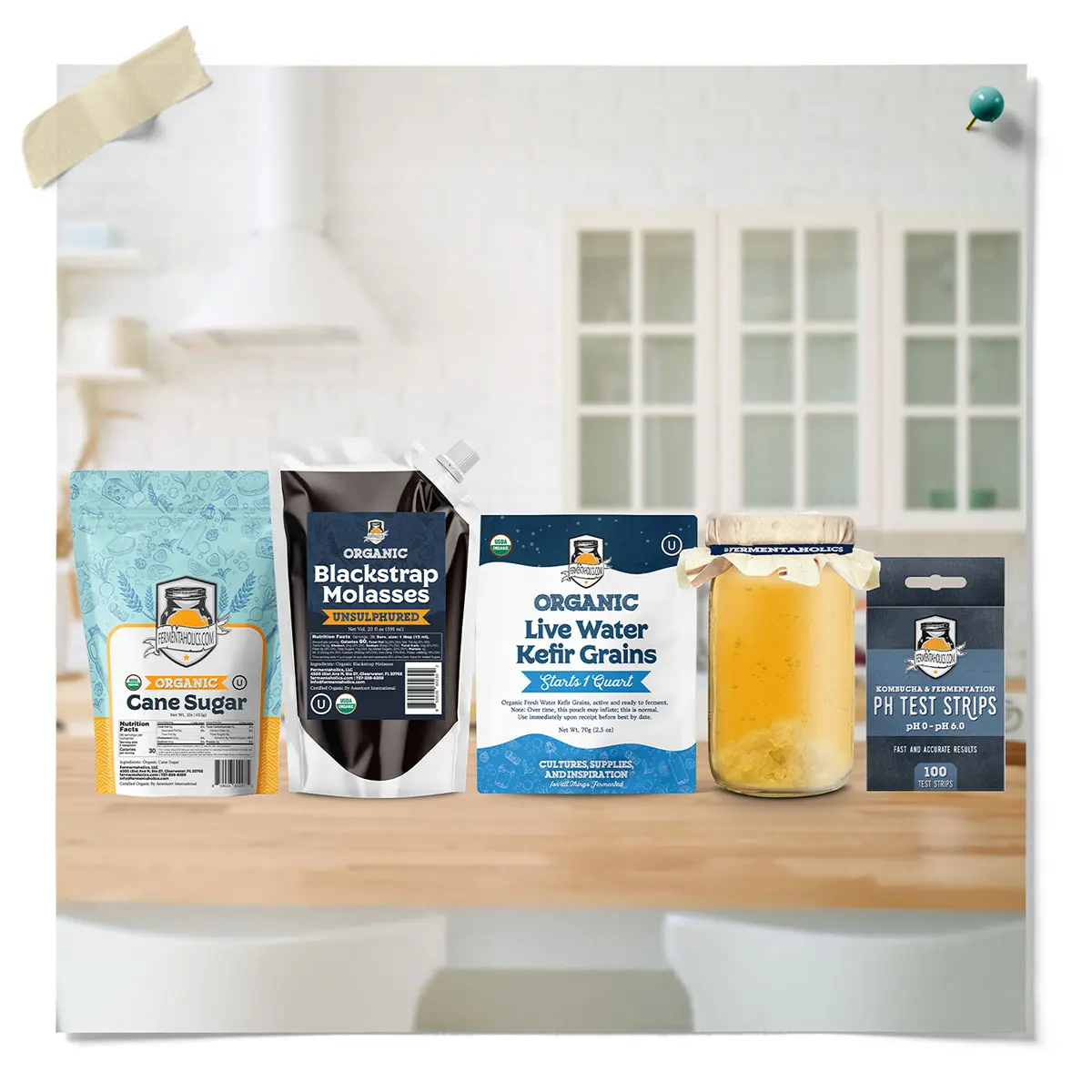 The step-by-step instructions to make your first full-quart batch of water kefir are included in this package, along with your ingredient list: filtered water and sugar.